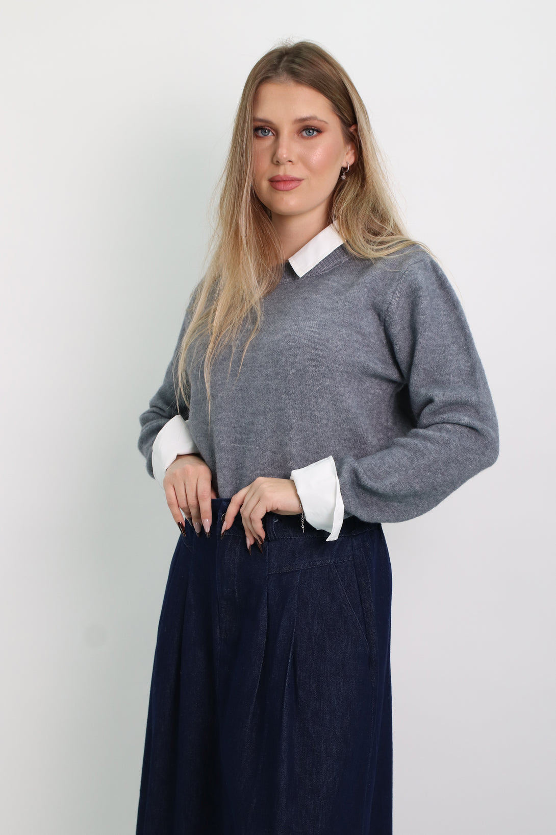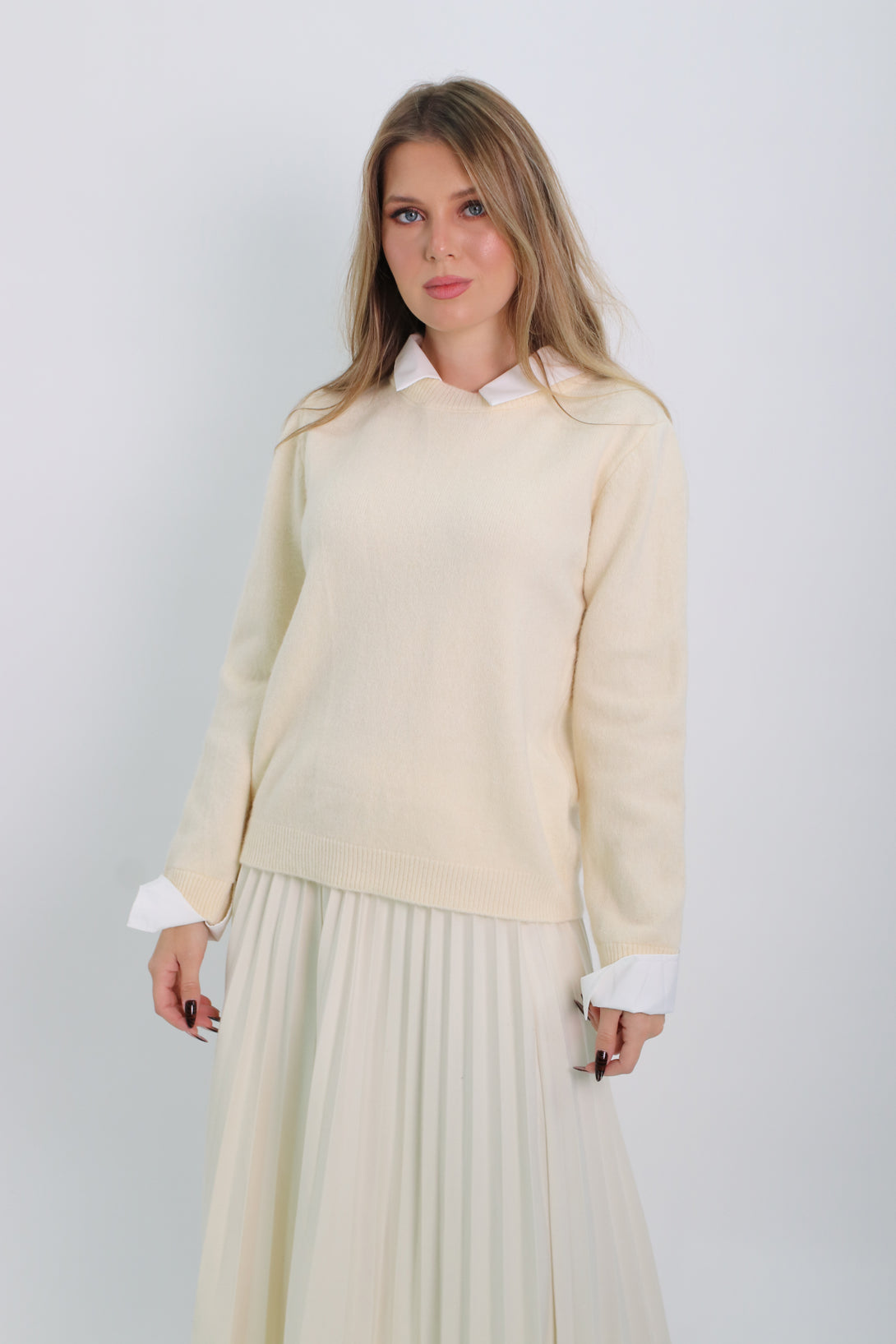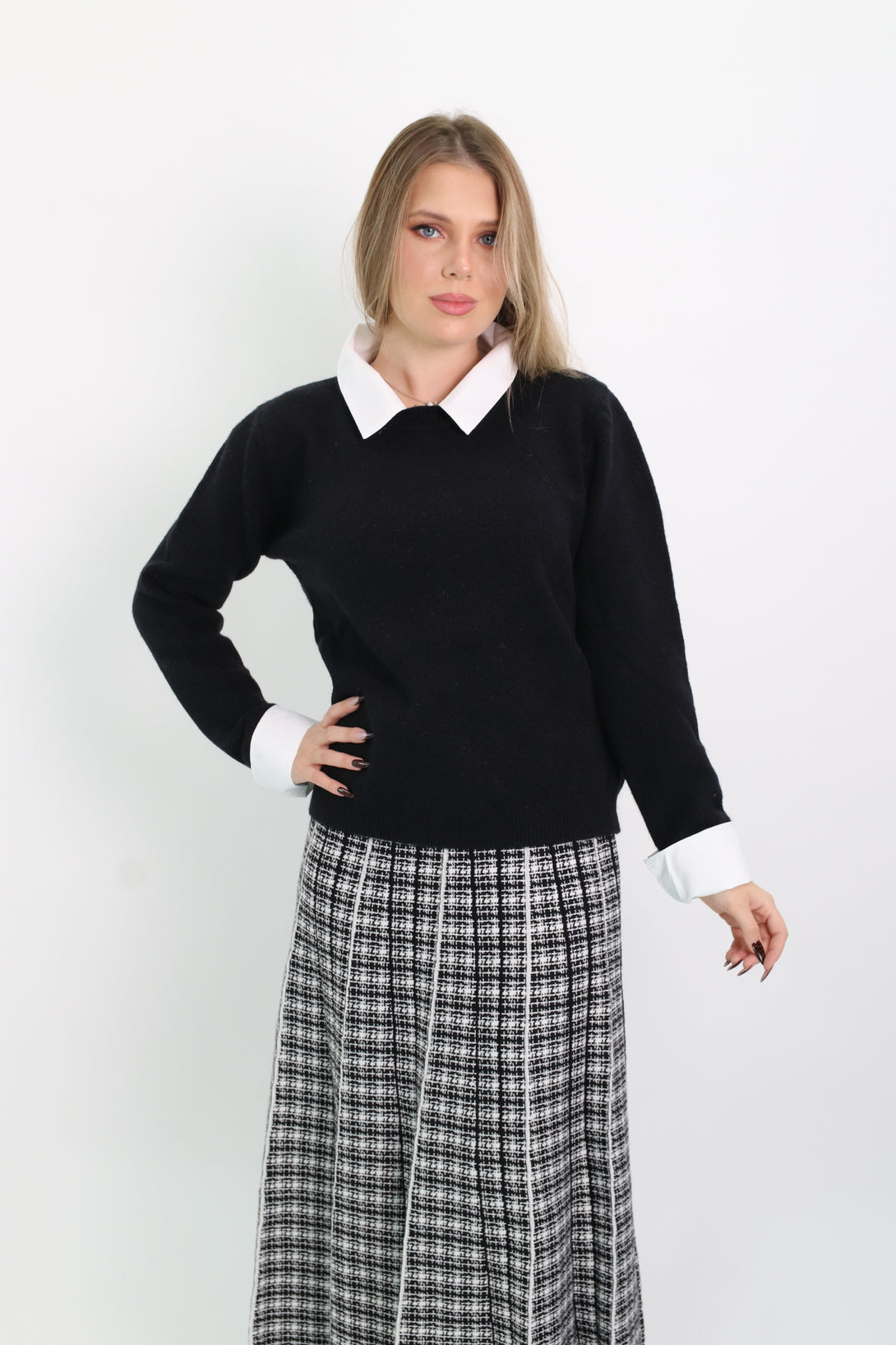 סריג משולב דמוי חולצת אוקספורד לבנה