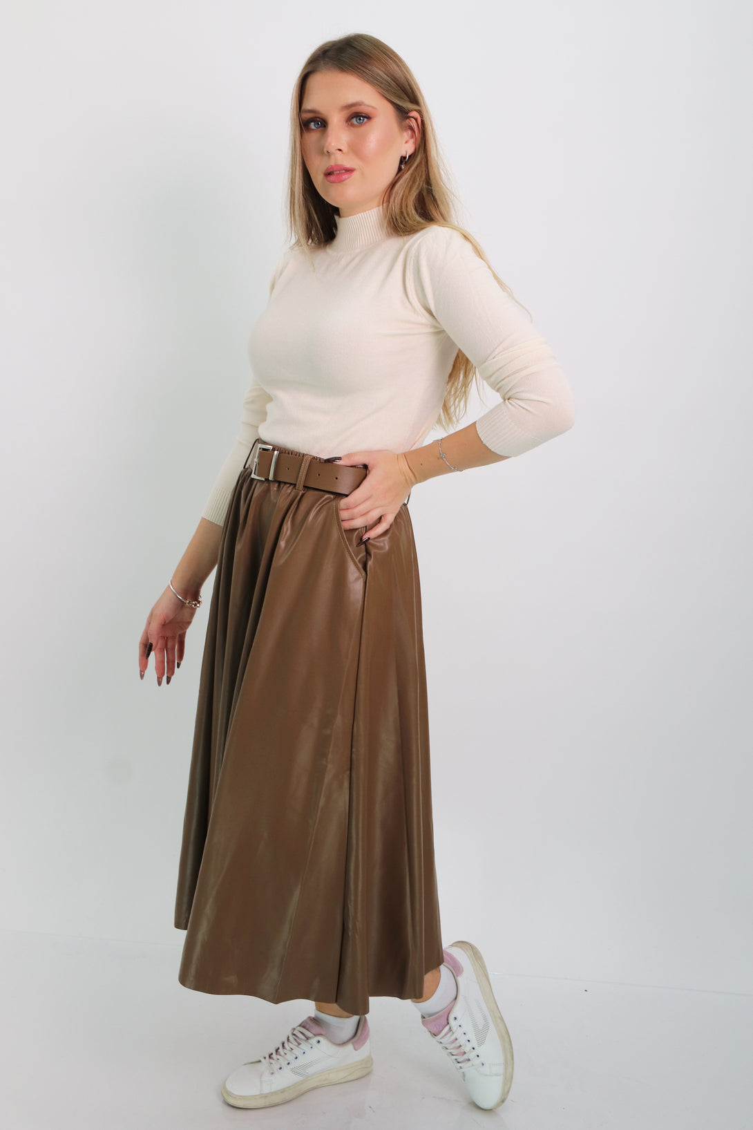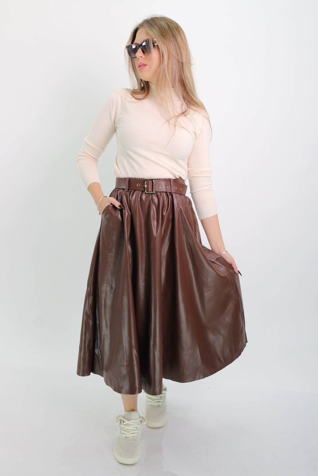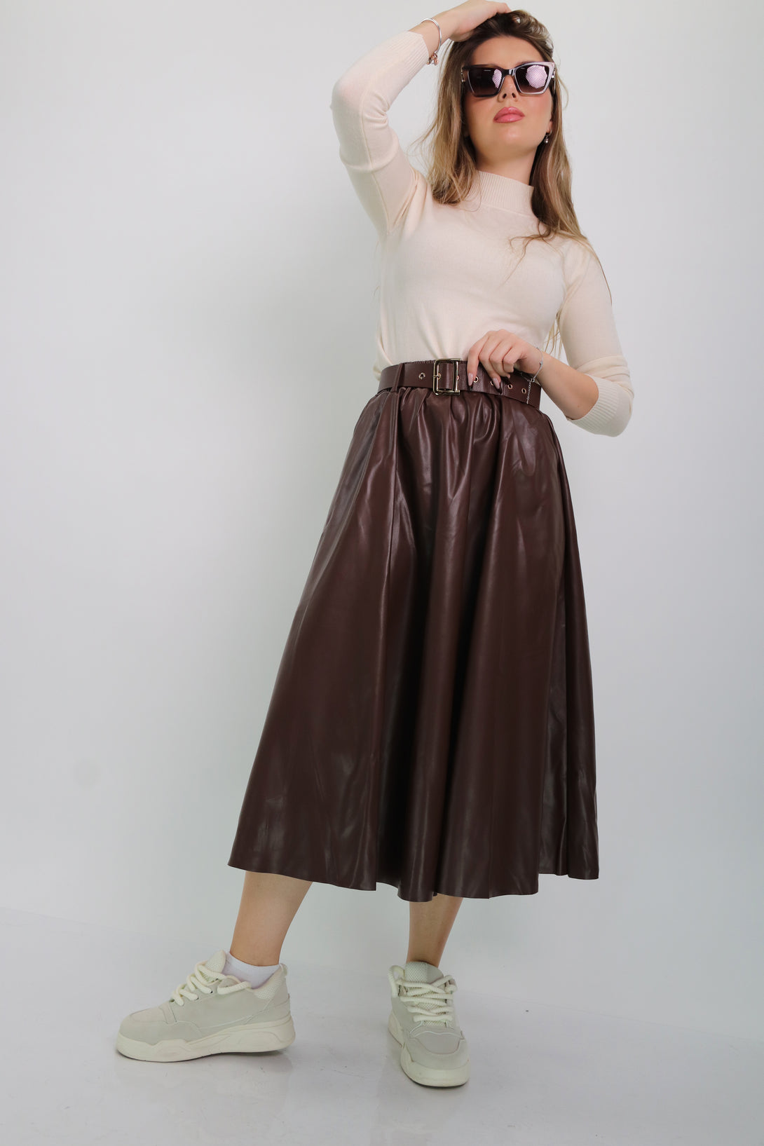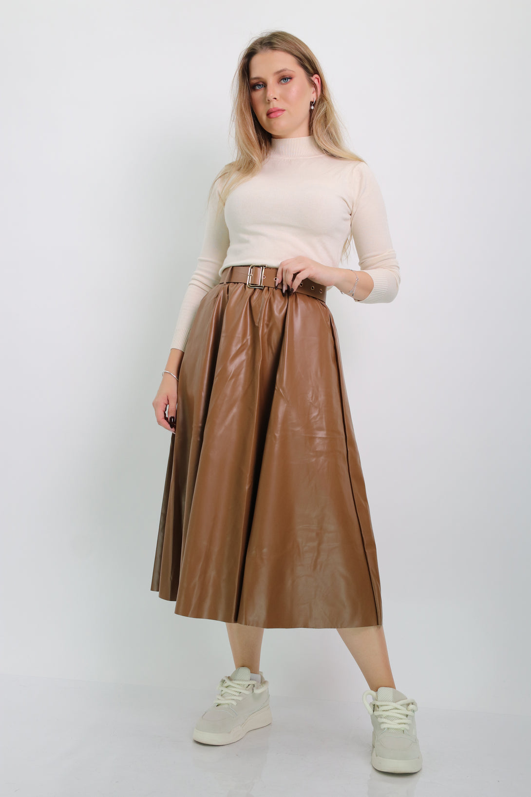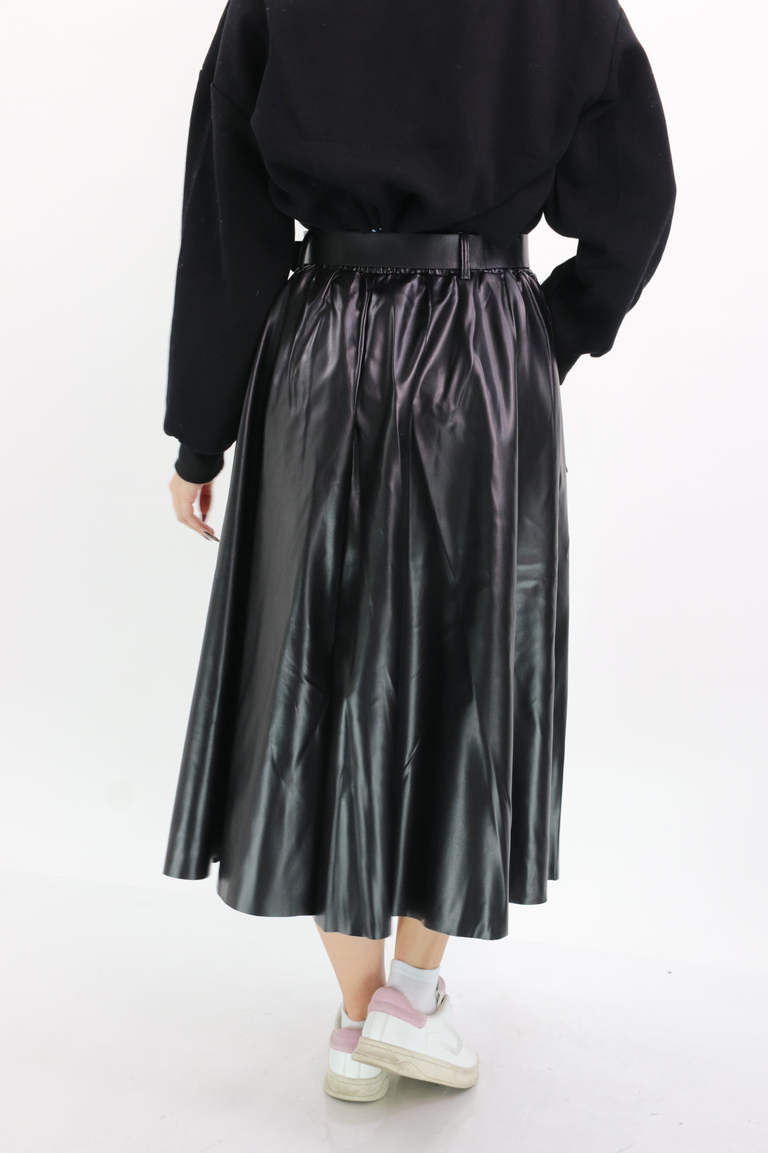 חצאית דמוי עור בגזרת קלוש משולבת גומי במותן וחגורה תואמת