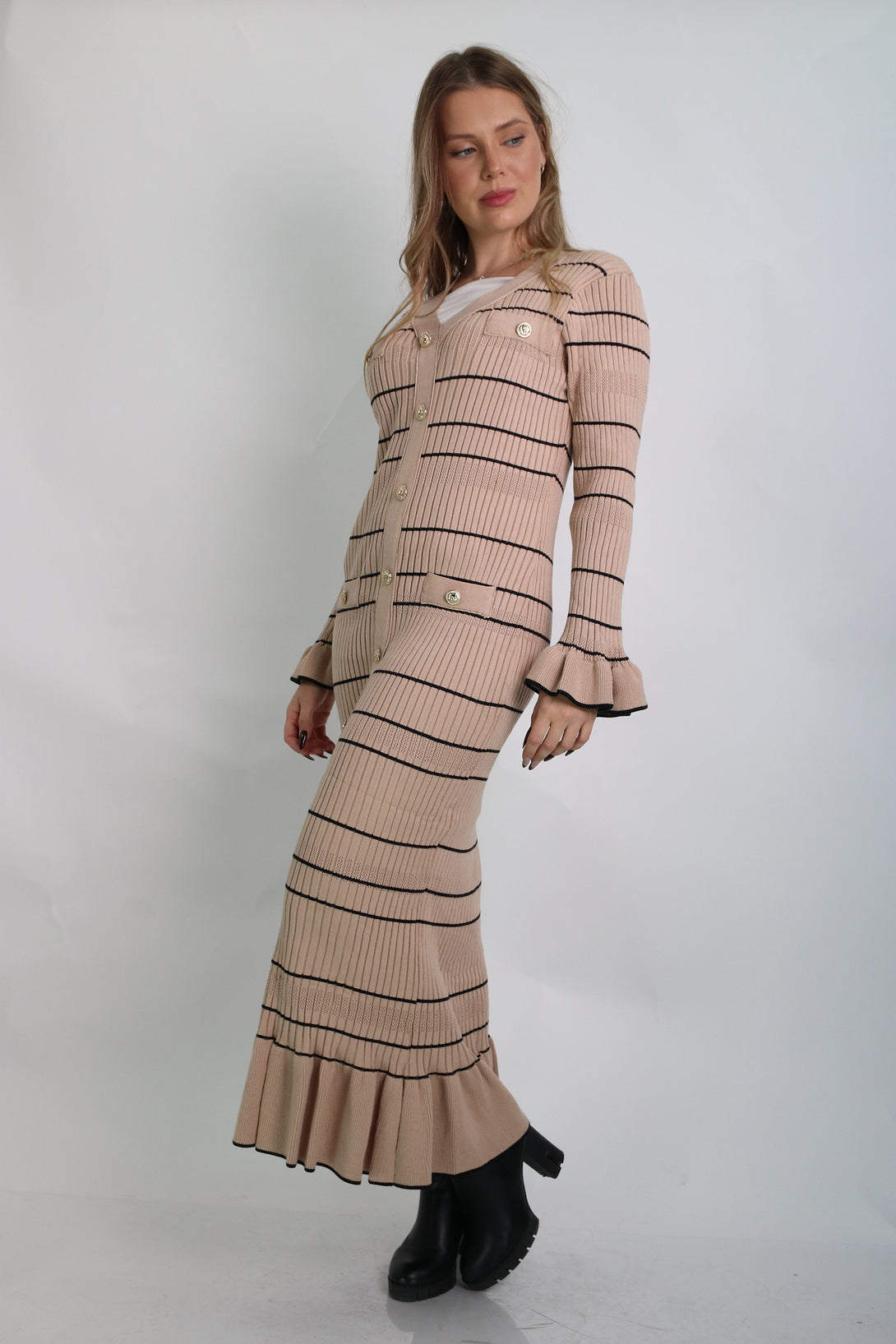שמלת סריג עם לייקרה משולבת כפתורי זהב מפתח וי עם פסים לרוחב וכיסים. מתאימה למידות S-M