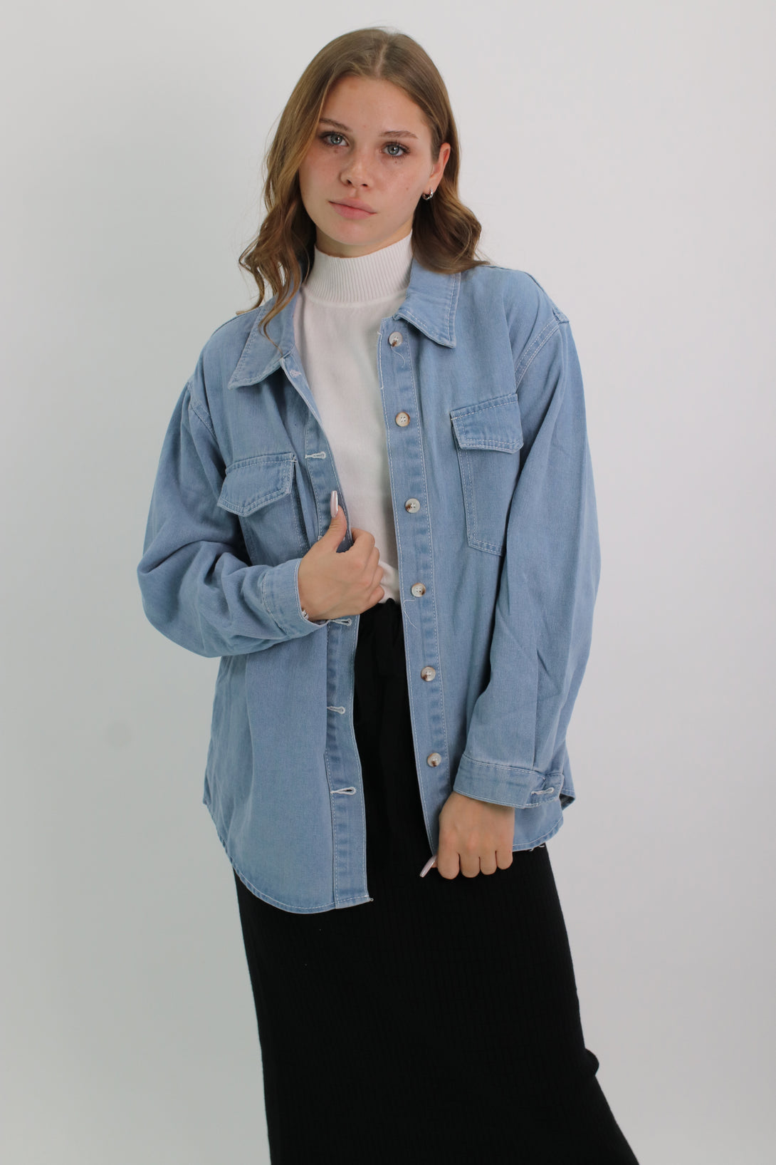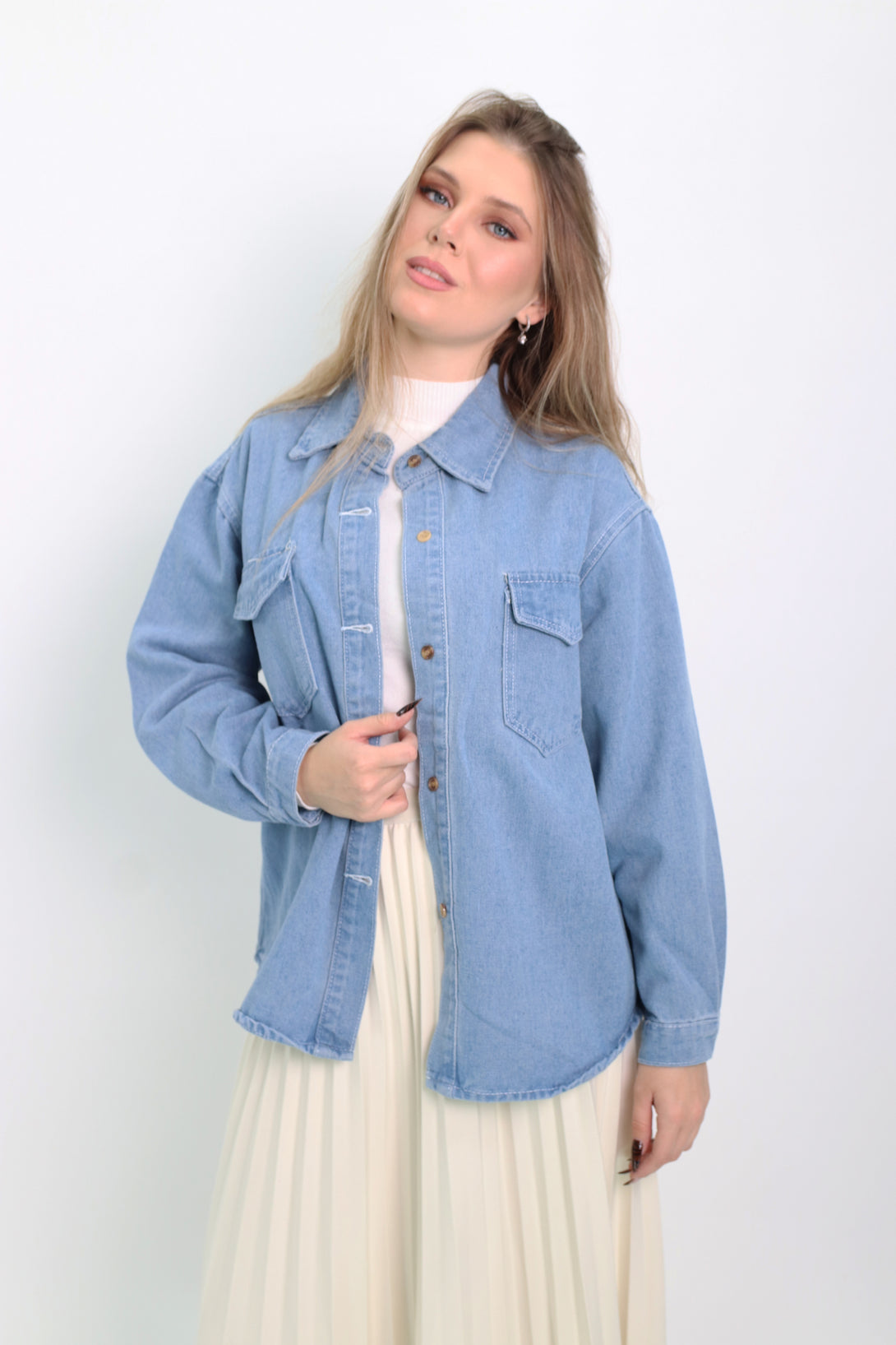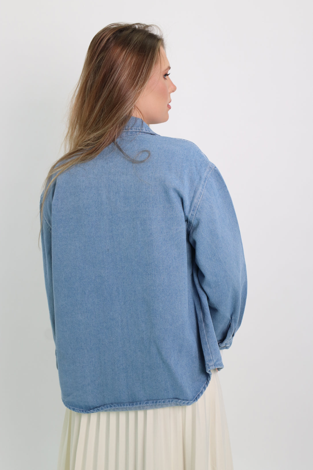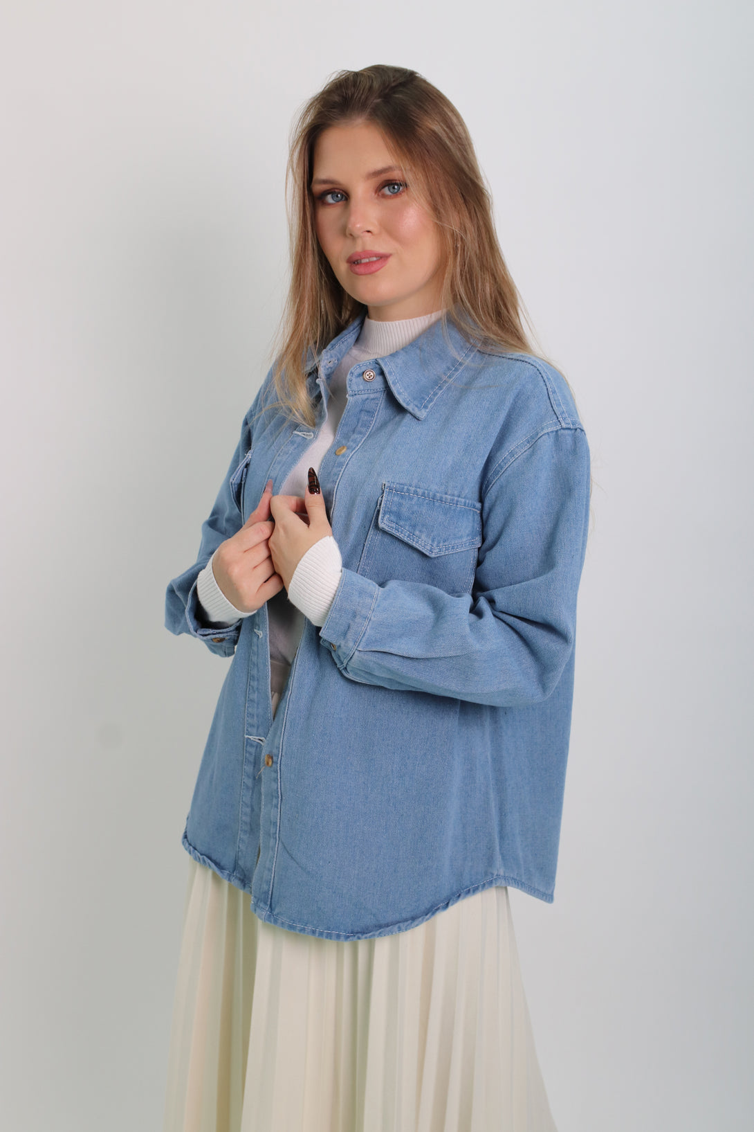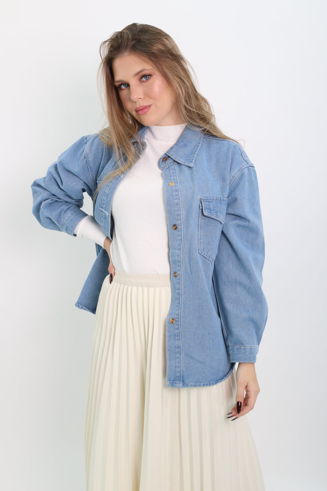 חולצת ג׳ינס מכופתרת משולבת כיסים ושרוולים ארוכים