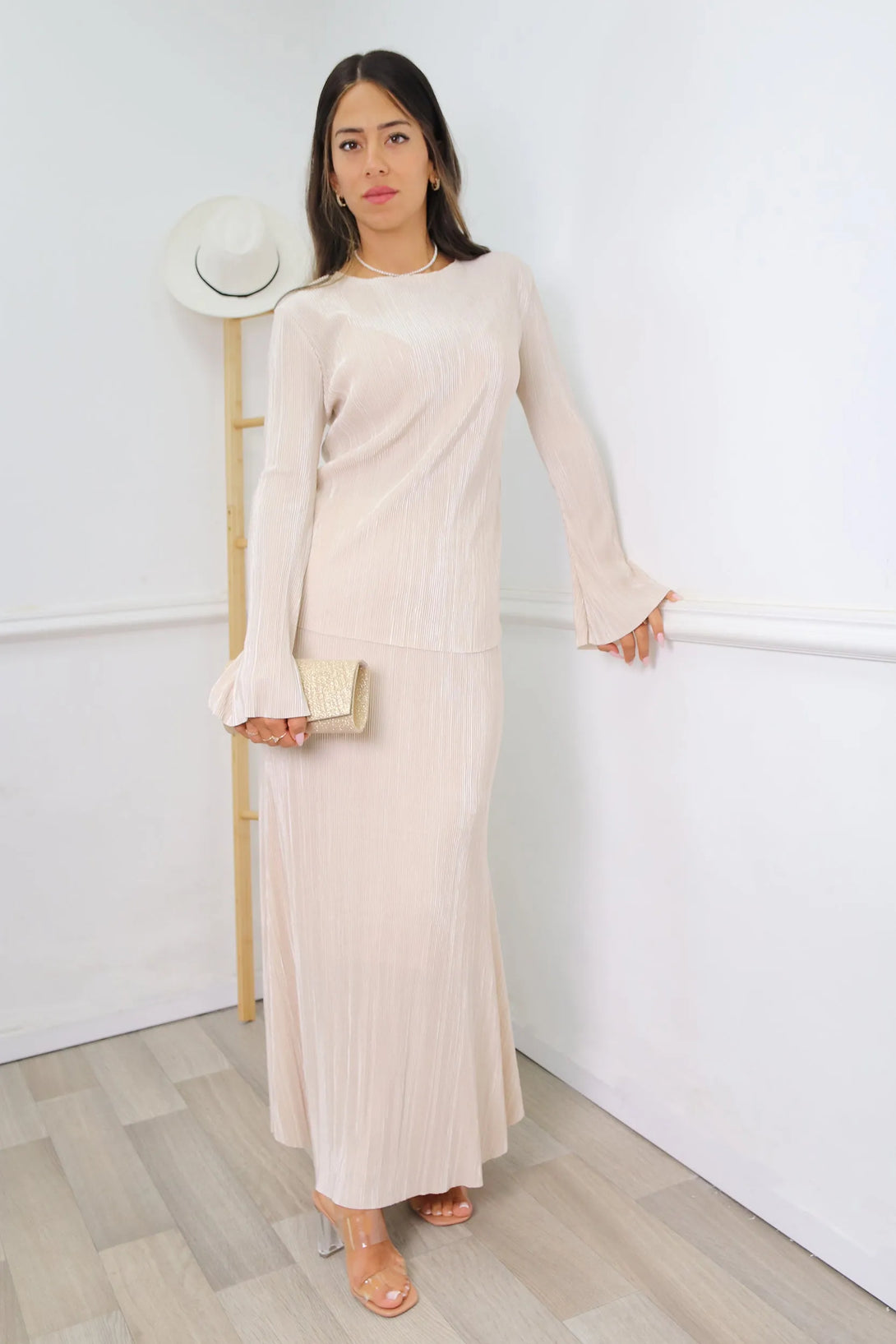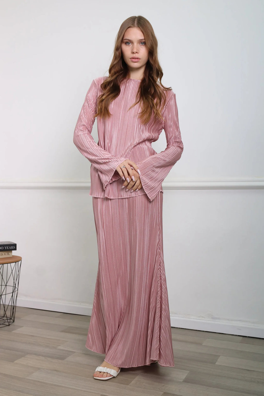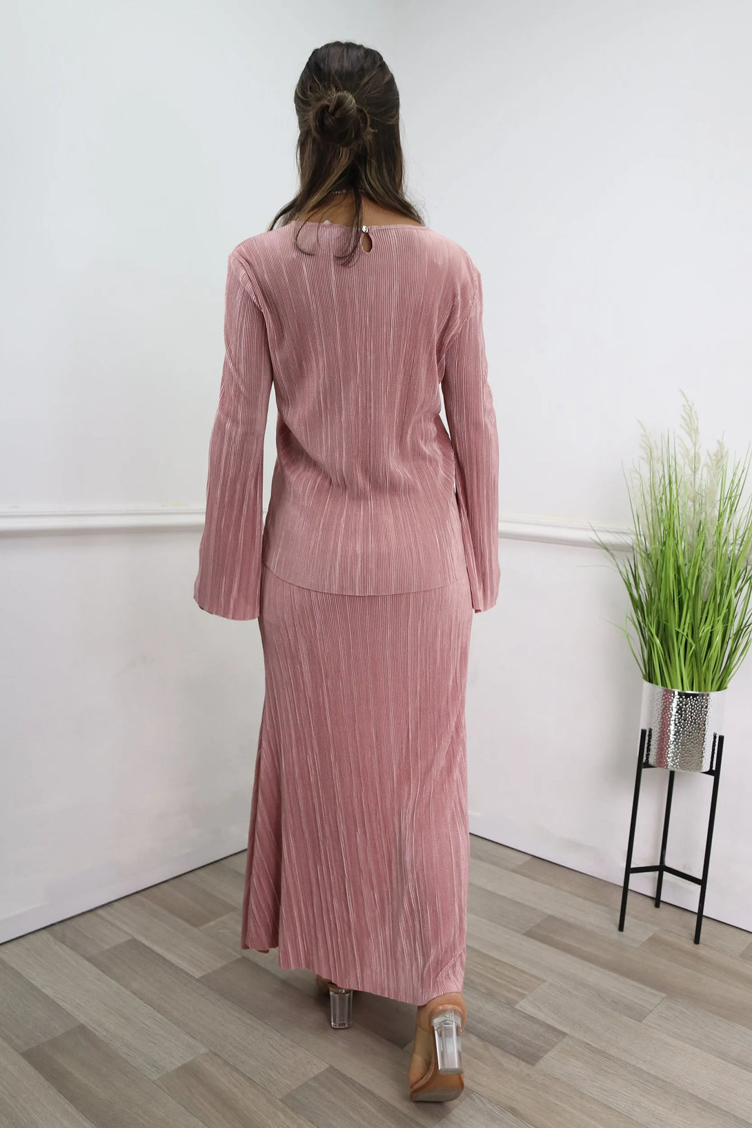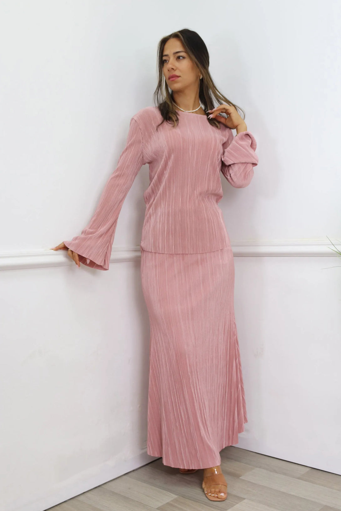 חליפת פליסה משולבת חולצת שרוול בלון וחצאית מקסי עם גומי