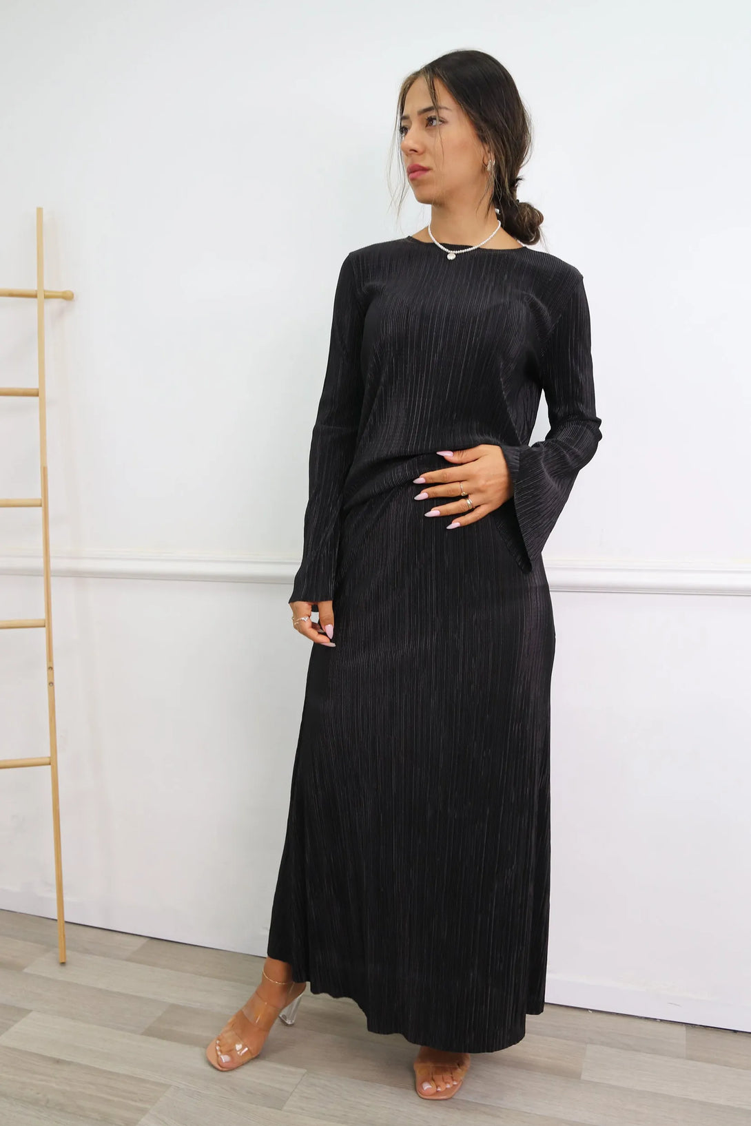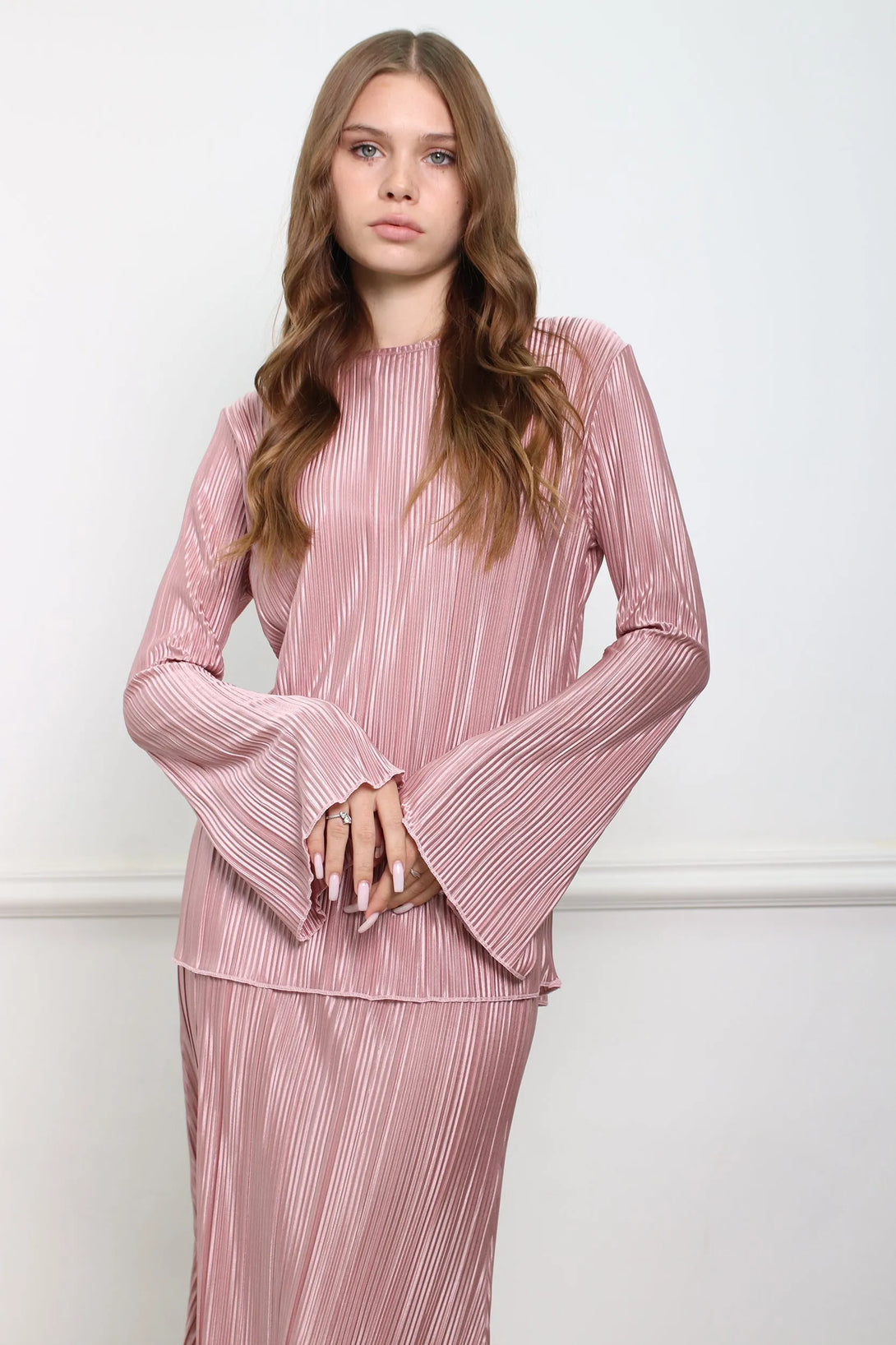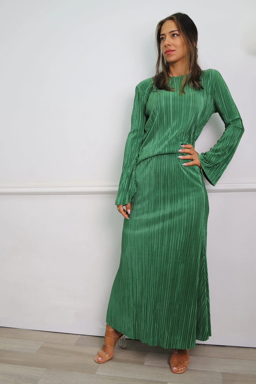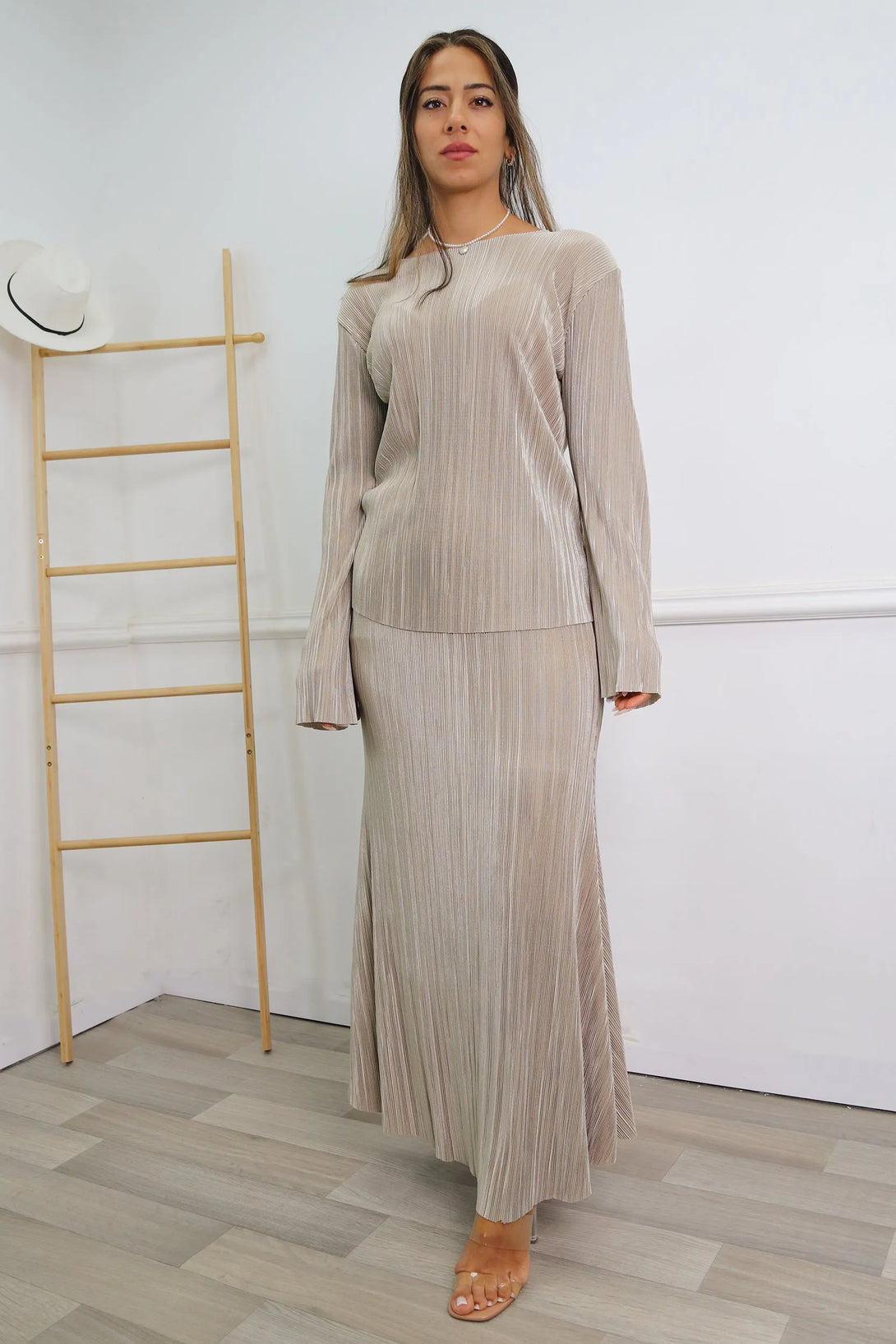 חליפת פליסה משולבת חולצת שרוול בלון וחצאית מקסי עם גומי