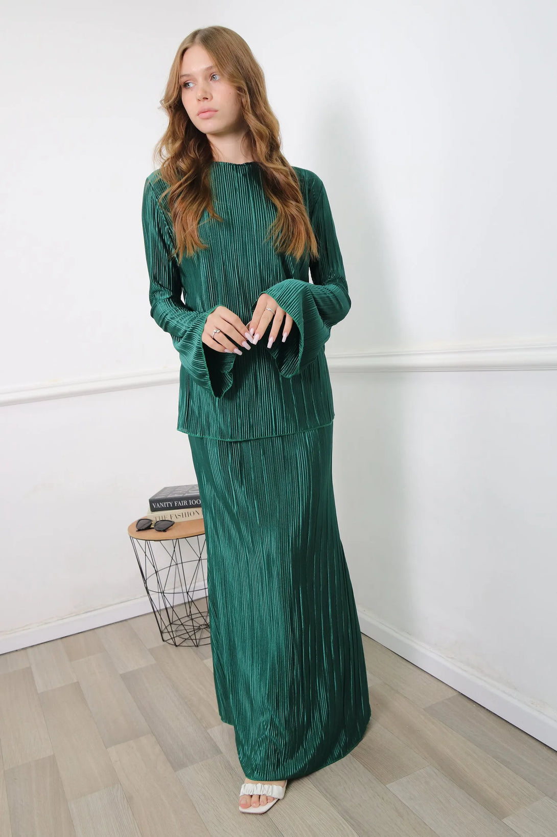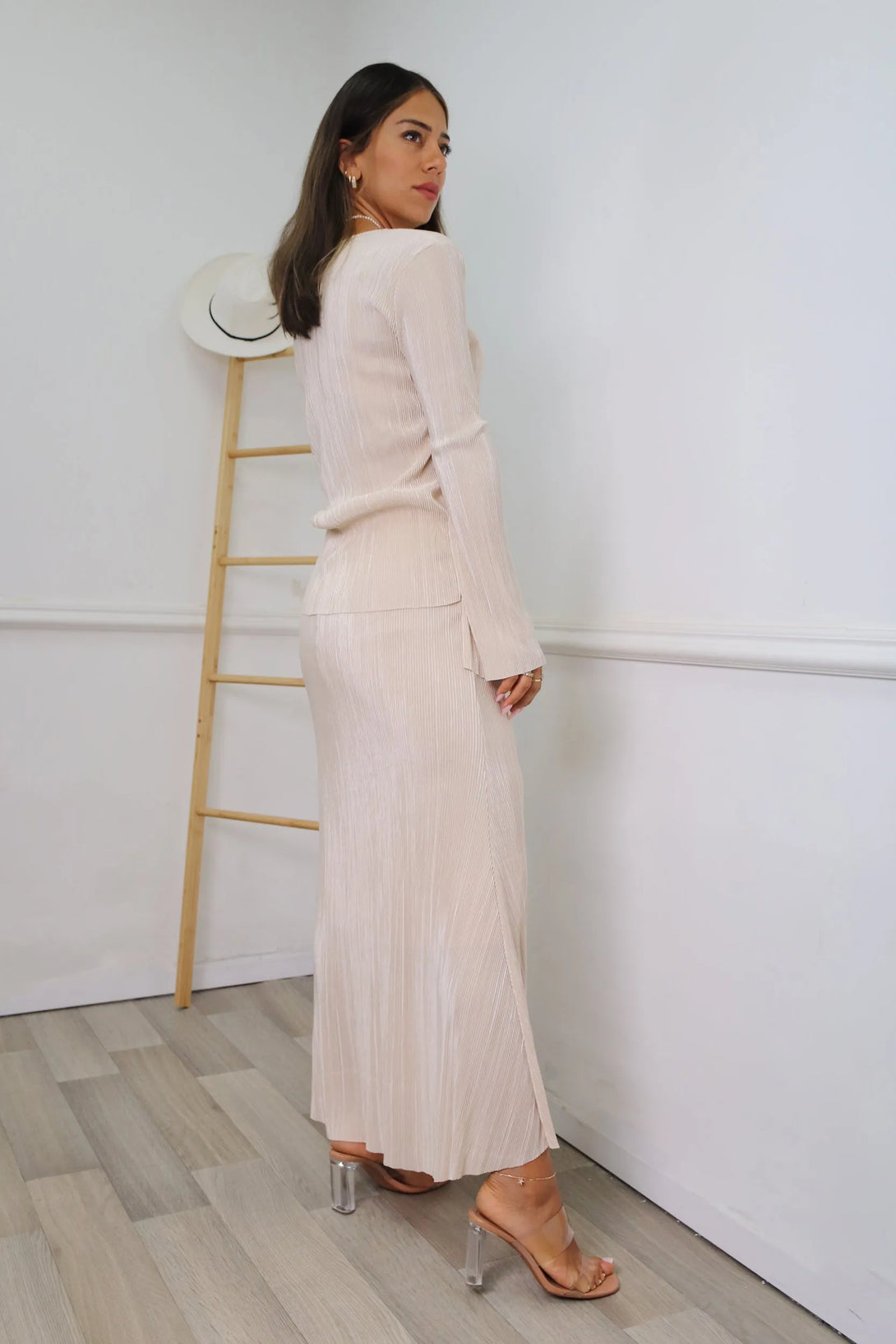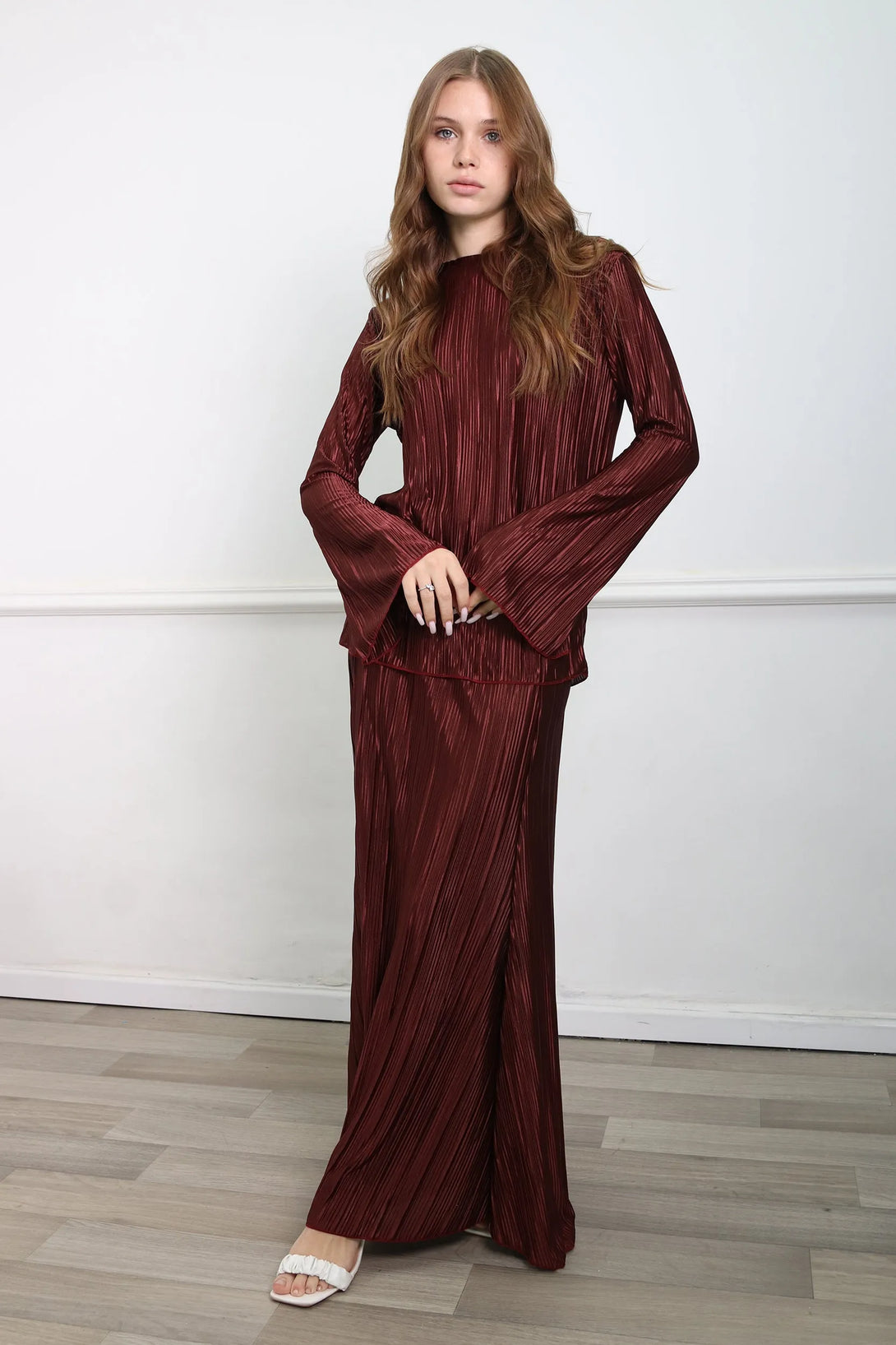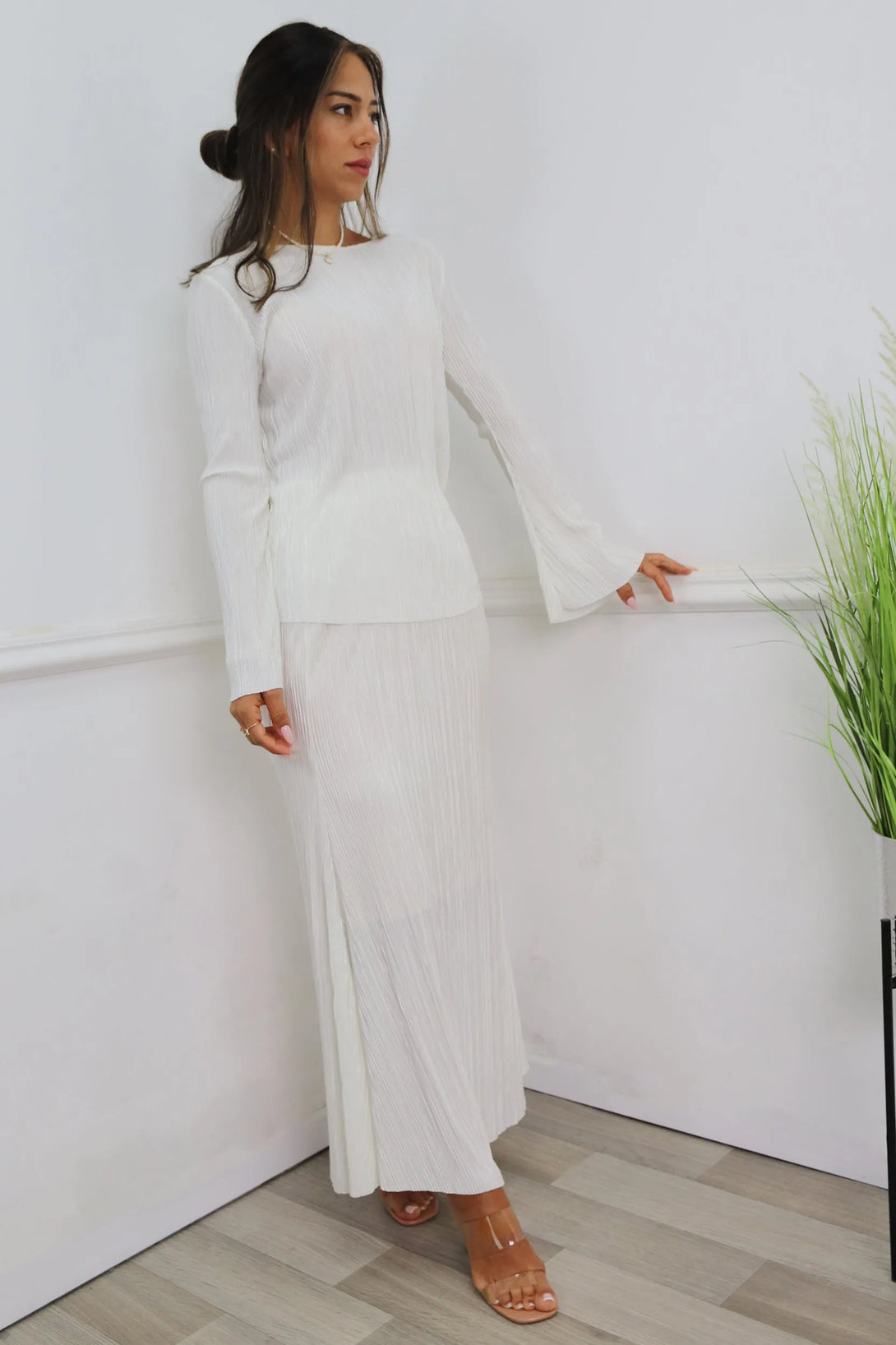 חליפת פליסה משולבת חולצת שרוול בלון וחצאית מקסי עם גומי